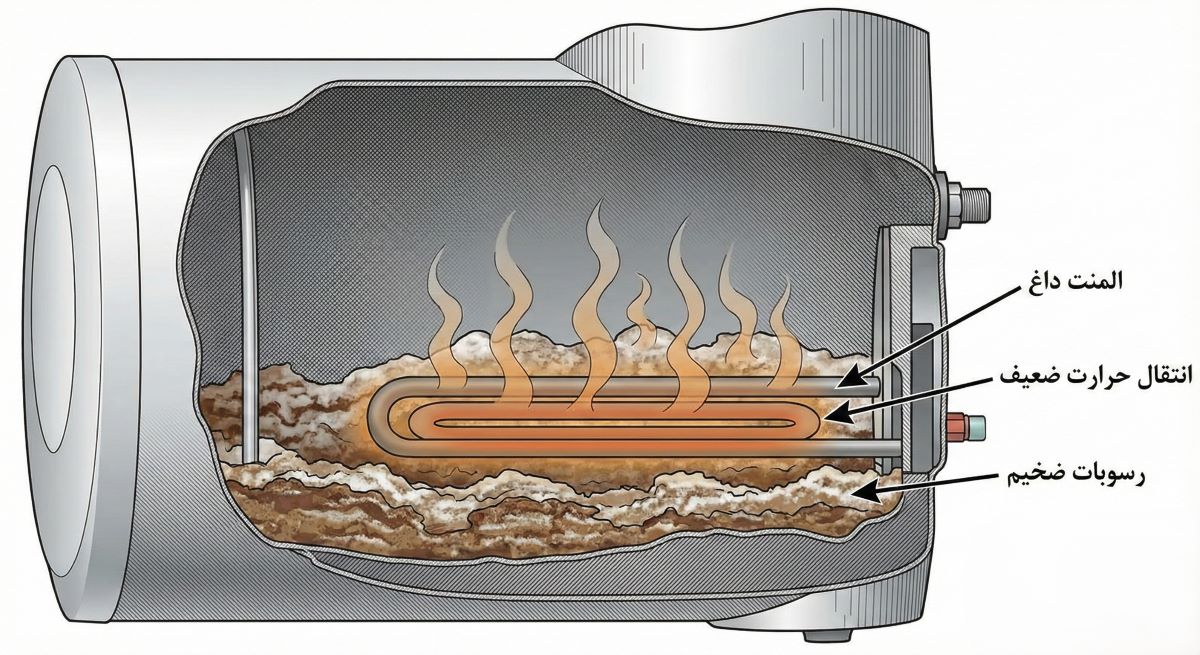 یکی دیگر از قاتلان خاموش آبگرمکنها، رسوب (Sediment) است. املاح و مواد معدنی موجود در آب سخت به مرور زمان در کف مخزن تهنشین میشوند. این رسوبات مانند یک عایق عمل کرده و مانع از انتقال موثر حرارت به آب میشوند. در نتیجه، المنتها یا مشعل باید برای مدت زمان طولانیتر و با انرژی بیشتری کار کنند تا همان حجم آب گرم شود.