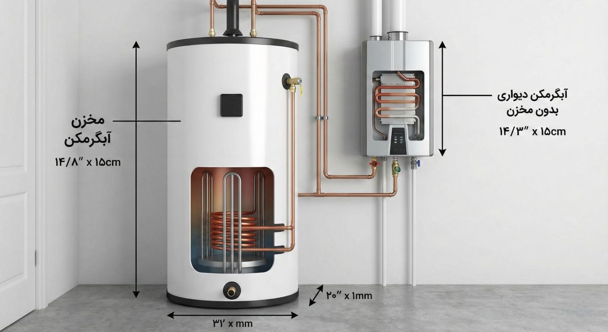 | ویژگی | آبگرمکن مخزنی (New Tank) | آبگرمکن بدون مخزن (Tankless/دیواری) |