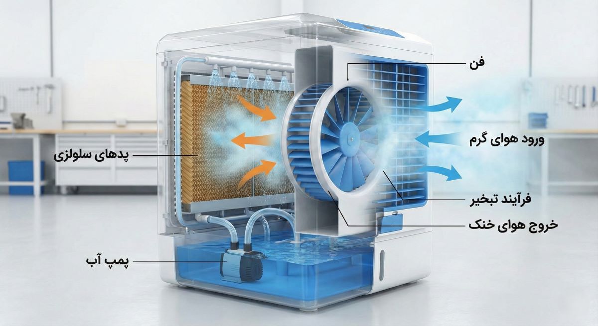 کولرهای آبی بر اساس اصل تبخیر آب کار میکنند و راندمان آنها به طور مستقیم به رطوبت نسبی هوا بستگی دارد.